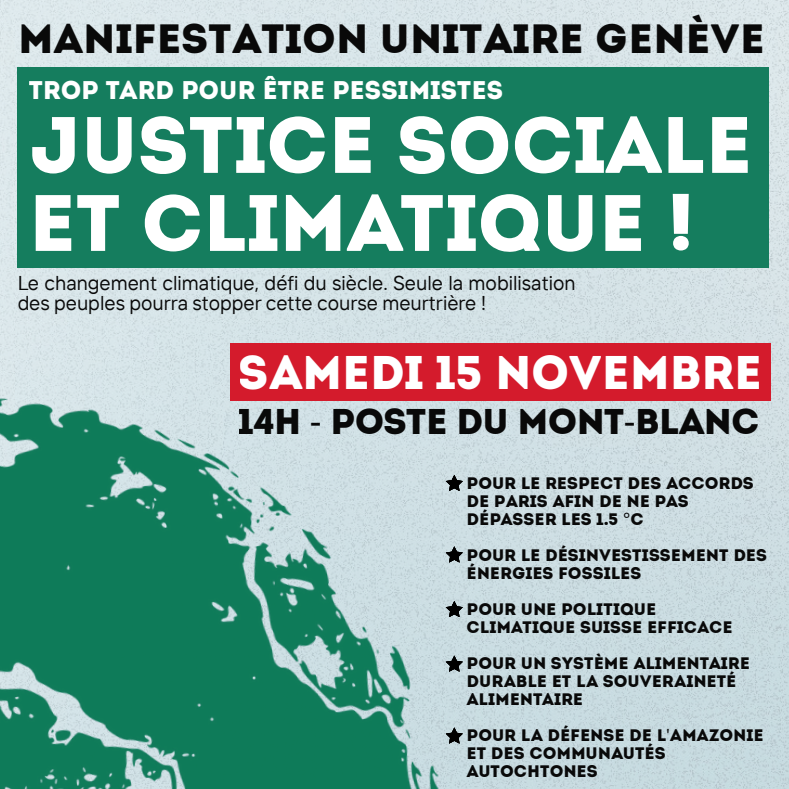 Le Sommet des Peuples qui aura lieu en parallèle à la COP officielle appelle à une mobilisation internationale pour la justice climatique le samedi 15 novembre. Ici, à Genève, nous appelons à une grande manifestation unitaire, transfrontalière, massive et plurielle en direction des Nations-Unies, pour dénoncer la dérive autoritaire et meurtrière du capitalisme fossile.
